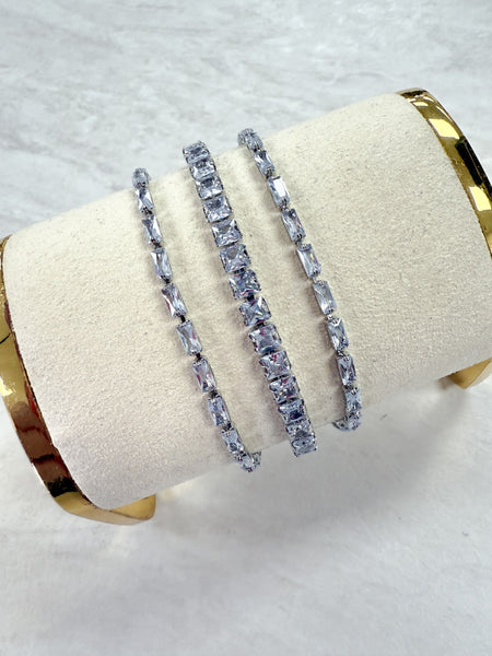 Sparkle in triple-threat style with this stunning tennis bracelet featuring three rows of geometric glamour. Rectangle baguette stones alternate with crisp square cuts, creating a modern mosaic of light that catches every angle.