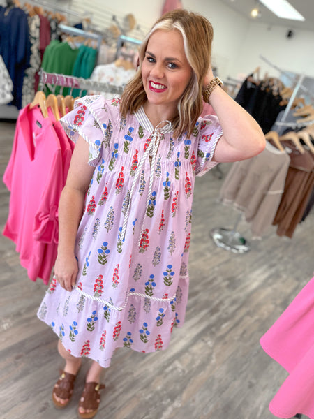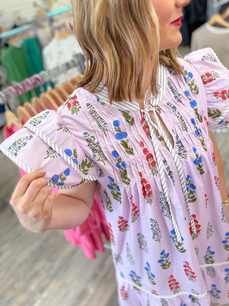 Twirl into spring in this enchanting Lilac Wonder Dress! Soft lilac pink fabric gets a romantic upgrade with delicate pintuck detailing. The charming tie neck adds a flirty touch, while contrasting details frame the figure in all the right ways. Adorned with a graceful floral print, this dress effortlessly transitions from brunch dates to garden parties.