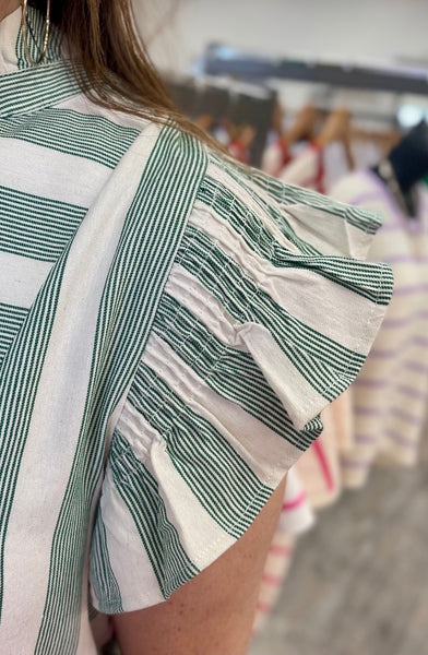 When We Met Dress: Meet your new favorite dress! This playful piece features charming ruffle sleeves and stylish stripe details, giving you a fun and flirty look. Perfect for any occasion, this dress will have you feeling confident and chic.