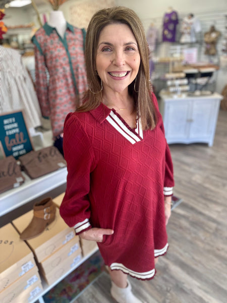 Step into style with our It's A Match Dress, featuring a fun textured fabric that adds playful dimension. Its classic collar pairs perfectly with contrasting ruffle-trimmed sleeves and bottom, giving this dress a charming and flirty flair. Perfect for twirling through your day with confidence and a touch of sass!