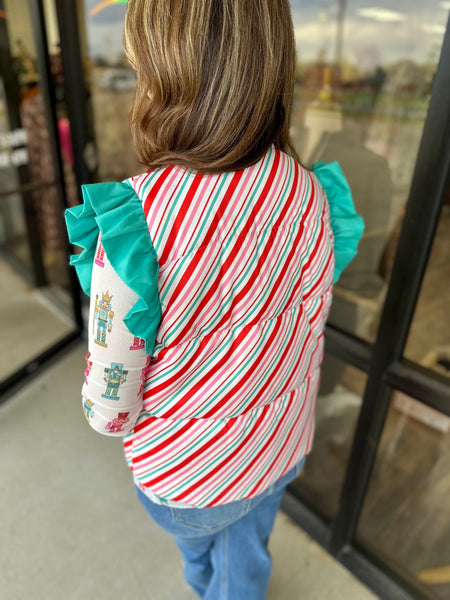 Rock the festive vibes with this playful Candy Stripe Puffer Vest! Featuring bold red, white, and teal candy cane stripes paired with an adorable teal ruffle shoulder detail, this vest is your ticket to standing out. Perfect for layering over your favorite tees or sweaters, it keeps you cozy while serving major style points.