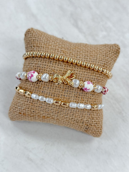 This Blue Toil Bow Bracelet Stack features a charming mix of blue toile beads, gold beads, and pearl beads, accented with a delicate gold bow. Its simple yet elegant design makes it perfect for adding a subtle touch of style to any outfit.