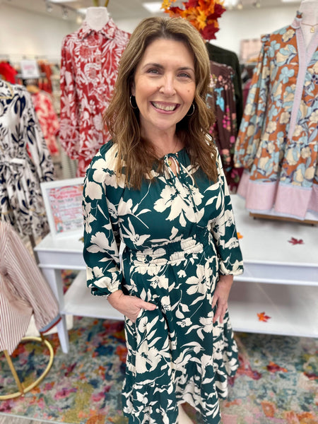 Meet your new favorite dress! The Effortless Elegance Dress brings together everything you love—long sleeves for coverage, a gorgeous deep green backdrop with cream florals that pop. The layered design adds dimension and movement, making every step feel a little more fun. Pair it with your favorite boots and you're ready to take on the day with style and sass.