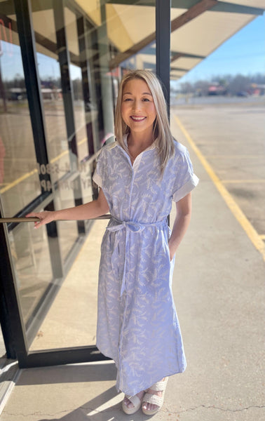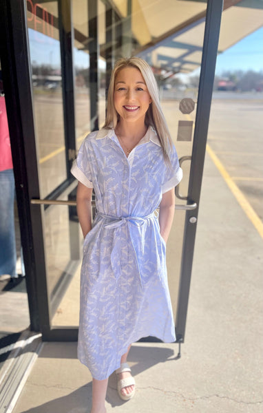Elevate your everyday style with this charming midi dress featuring soft blue vertical stripes that elongate your silhouette. The hidden button-down front offers effortless versatility, while the tie waist cinches for a flattering fit. Crisp white contrasting collar and sleeve trim add preppy polish, complemented by delicate white floral details that bring a touch of whimsy.
