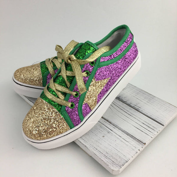 Step into the spirit of celebration with these dazzling Mardi Gras Glitter Star Sneakers! Featuring a show-stopping blend of festive gold, purple, and green glitter that catches the light with every step, these kicks bring the party wherever you go.