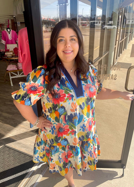 Electric Bloom Dress Brighten your wardrobe with this vibrant floral stunner! Featuring a bold mix of navy, coral, yellow, orange, and blue blooms, this dress brings the garden party energy wherever you go. The charming puff sleeves add a playful touch, while the navy contrasting neckline keeps things polished.