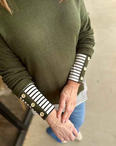 Elevate your casual wardrobe with this Street Style Knit Top—a playful twist on layered fashion. Crafted from cozy thermal material in olive, it features chic black and white striped accents along the sleeves and hem that create the illusion of a coordinated top peeking underneath. Wooden button details on the sleeves add a touch of rustic charm and visual interest. Perfect for effortless, put-together looks that feel anything but basic.
