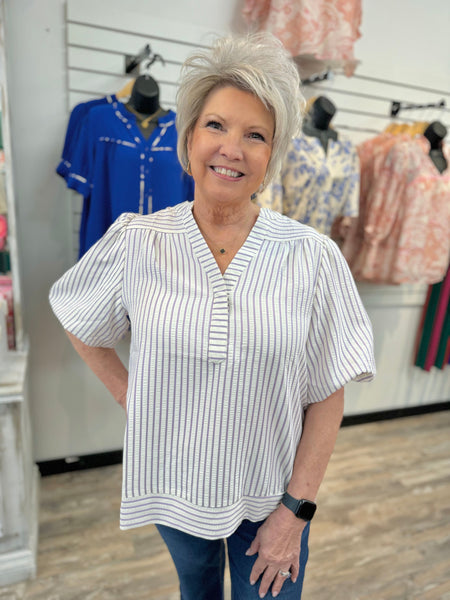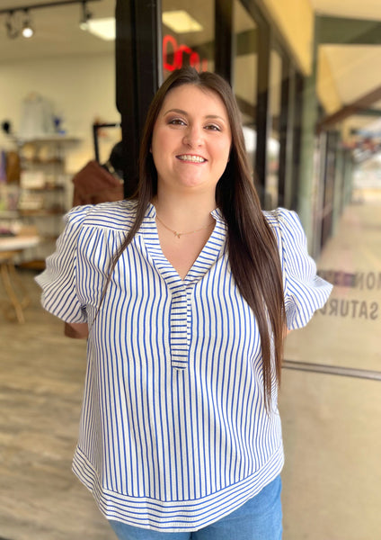 Get ready to sail away in style with our Sea Breeze Top! This playful top features flattering stripes and fun puff sleeves, perfect for adding some flair to any outfit. Embrace your playful side with this quirky top.