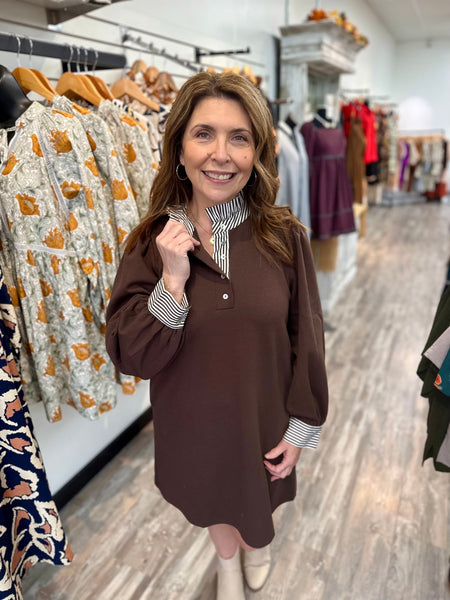 Elevate your everyday style with the Finishing Touch Dress—a playful piece that does the heavy lifting for you. Choose between rich brown or bold red, then rock the long sleeves and charming straight ruffle collar that frame your face beautifully. Striped contrasting details add visual interest, while the half button-down front gives you that effortless, put-together vibe.