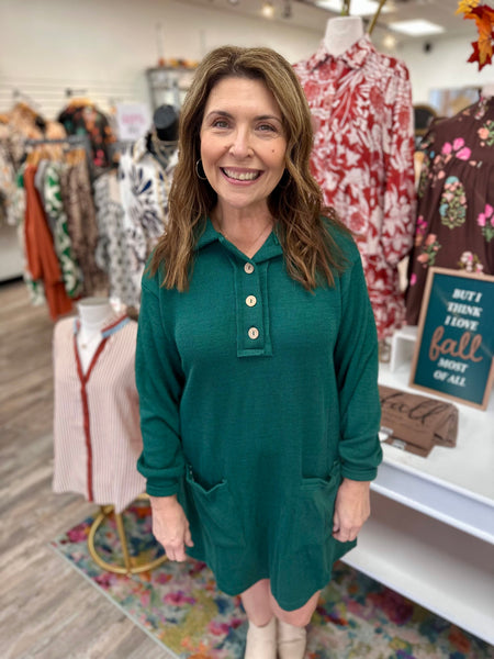 Embrace cozy-chic vibes with the Crisp Air Cutie Dress, your new go-to for effortless style. This charming piece features a classic half button-down design with adorable wooden button details that add rustic flair. The structured collar and practical pocket details make it perfect for layering or wearing solo. Crafted in a gorgeous green hue, this long-sleeve dress transitions seamlessly from casual coffee dates to weekend adventures. Whether you're dressing it up or keeping it laid-back, this cutie delivers comfort and personality in every wear.