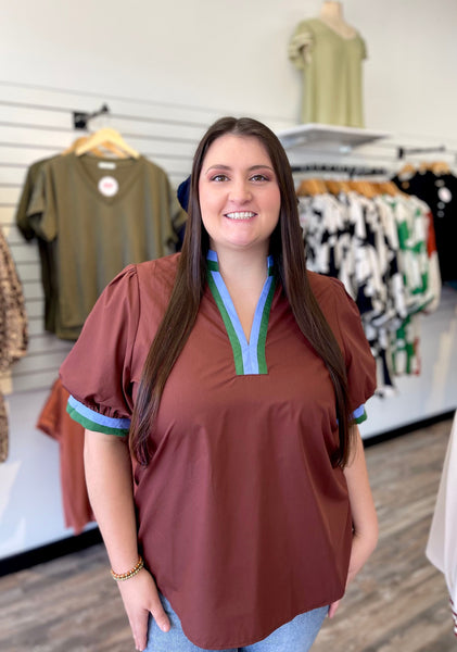The Better Now Top is a playful twist on classic style with its black base and puff sleeves trimmed in charming brown and white accents. The high neck adds a touch of sophistication, making it perfect for those who want to stand out with subtle yet striking details. This top effortlessly blends comfort with a flirty edge, ideal for adding personality to your everyday wardrobe.