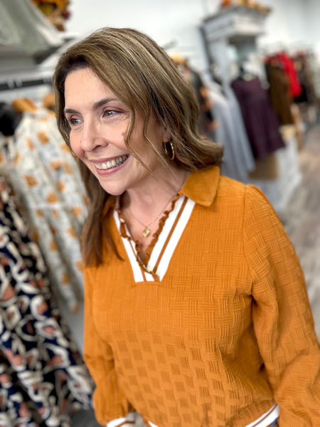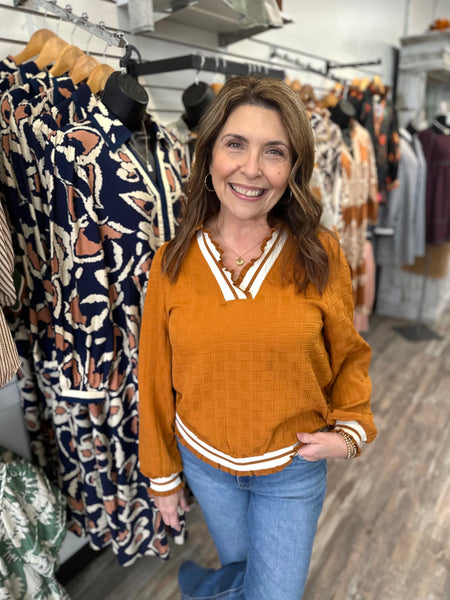 Elevate your everyday style with this playful textured top that's anything but basic! Featuring a charming collar and delicate ruffle trim, it's designed to turn heads with its contrasting details that add just the right amount of sass. Choose between rich olive or warm camel to match your vibe. Perfect for pairing with your favorite bottoms, this versatile piece brings personality and polish to any outfit.