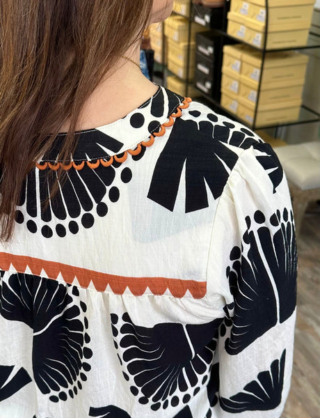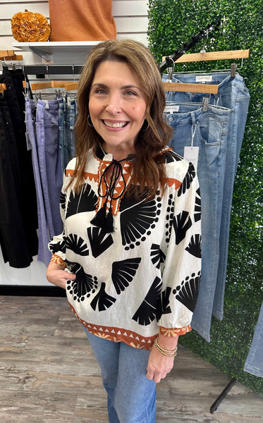 Elevate your everyday style with this playful Abstract Neutrals Top! Featuring a bold, eye-catching abstract print in neutral tones, it's the perfect canvas for expressing your unique vibe. The three-quarter sleeves offer just the right amount of coverage, while decorative trim details add a touch of sophistication. A charming tassel neck tie brings movement and personality to the neckline. Versatile enough for casual outings or dressed-up occasions, this top is your new go-to piece for effortless style.