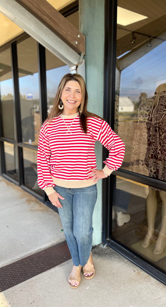 Bring a splash of fun to your wardrobe with the Bold and Banded Top. Featuring playful red and white horizontal stripes paired with a contrasting off-white trim, this oversized fit offers both comfort and style. Perfect for lounging or casual days out, its cute design makes it an easy favorite for any occasion.