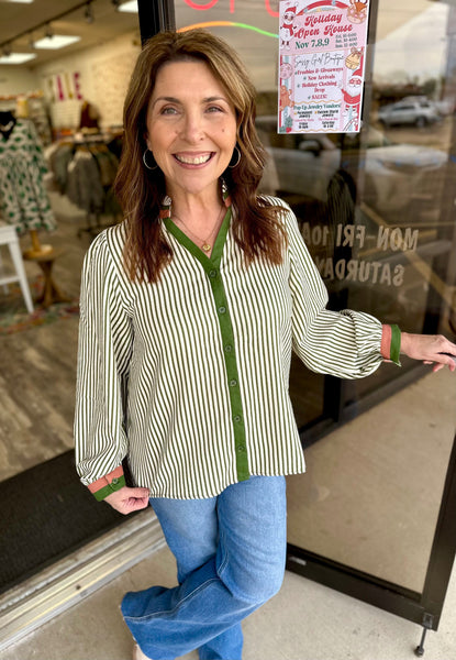 This playful Take It Easy Top features bold brick and white vertical stripes with contrasting dusty blue and brick accents on the neckline and sleeve hems. The ruffled neck adds a fun, flirty touch while the button-down front keeps it casual and versatile. Perfect for adding a splash of color and style to any outfit.