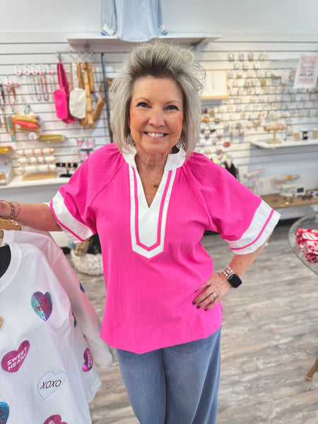 The Elevated Essential Top brings effortless style with its breezy gauzy fabric and bold hot pink hue. Wide white contrast details frame the neckline and sleeves, creating a chic pop that works equally well dressed up or down.