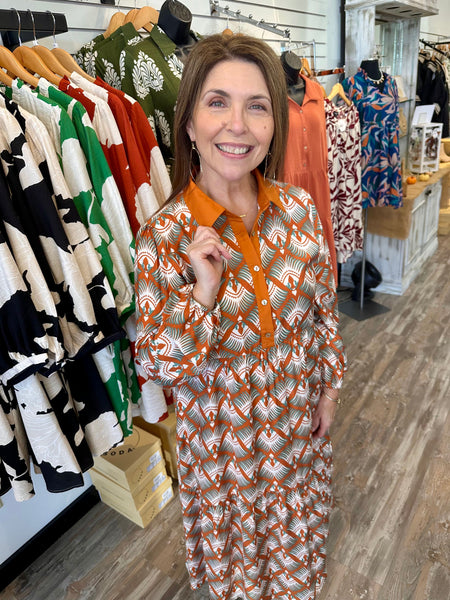 Embrace autumn’s charm with the Life’s A Dance Dress—a rust-colored delight adorned with a large cream and sage floral pattern. This playful long dress features a charming collar that adds a touch of whimsy to your fall wardrobe, making it perfect for twirling through the season with style and ease.