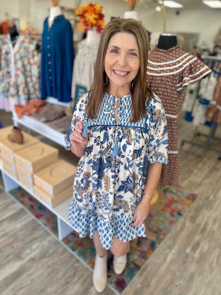 This playful Love You So Dress features charming 3/4 sleeves and a delicate tie neck, perfect for crisp fall days. The delightful blue print adds a touch of whimsy, while its flattering fit pairs effortlessly with your favorite boots for a cute, look that’s ready for any autumn adventure.