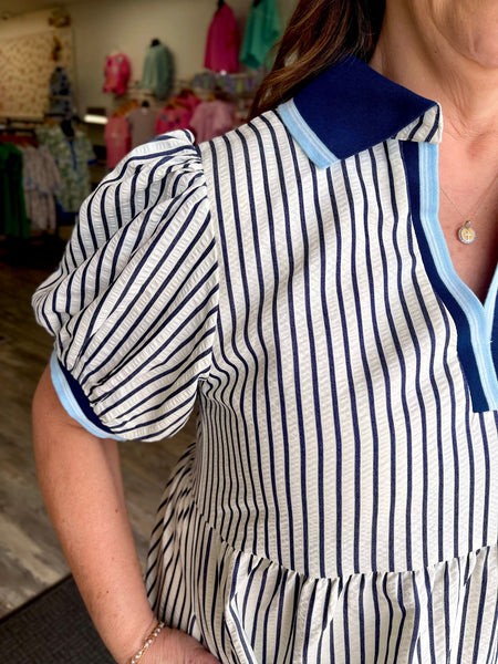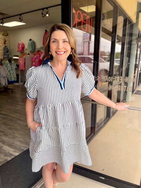 Escape to coastal charm with this Sea Side Escape Dress, featuring classic navy and white vertical stripes that elongate your silhouette. The tiered design adds playful movement and dimension, while a crisp collar frames your neckline with timeless elegance. Sky blue contrast details provide a refreshing pop of color that captures the essence of seaside serenity.
