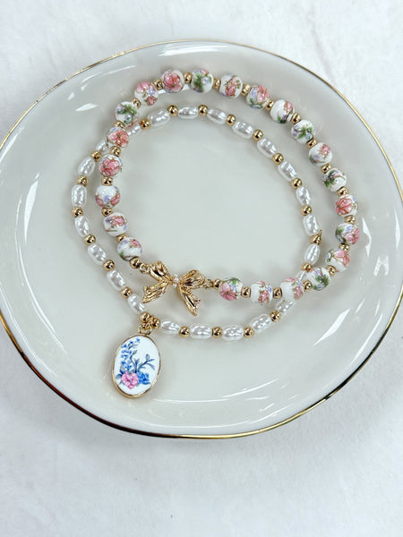 Elevate your wrist game with our Tea Party Bracelet Set. Choose between classic blue and white or soft pink and green toile printed beads, paired with lustrous gold accents and delicate pearl beads.