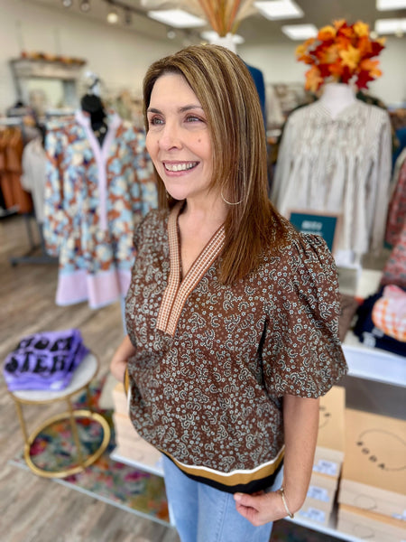 The Lainey Top brings playful charm with its puff sleeves and flirty v-neck design. Featuring delicate blue floral patterns, this top adds a touch of whimsy to any outfit. Perfect for brightening your wardrobe with a fun, feminine flair.