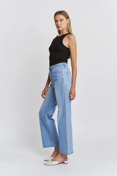 These aren't your average jeans—they're a statement piece that turns heads. High-rise cut with a flattering wide-leg silhouette, paired with delicate pearl embellishments cascading down each leg for that extra touch of glam. Perfect for elevating your everyday look or dressing up for a night out.