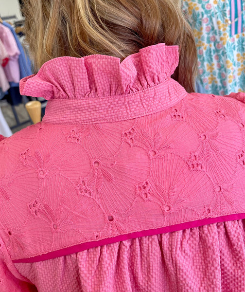 Elevate your wardrobe with this charming Girly Flare Dress in peony pink. Featuring textured fabric and bubble sleeves adorned with intricate floral eyelet detailing, this dress brings effortless elegance to any occasion. The flattering V-neckline is finished with a ruffled trim that adds a playful touch, while the coordinating eyelet pattern along the neckline creates a cohesive, polished look.