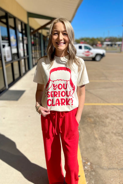 Channel your inner Clark Griswold with the You Serious Clark Tee. This playful shirt is perfect for fans of National Lampoon's Christmas Vacation who appreciate the Griswold's iconic hat and dry humor. Whether you're decking the halls cracking a smile, or setting your tree on fire, this tee brings a fun nod to Clark. Comfortable and ready for holiday laughs!