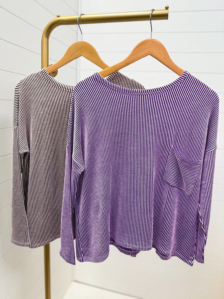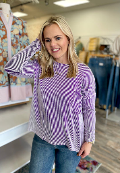 Step into comfort with the Simple Lines Top—your new go-to for playful style! This long-sleeve, ribbed beauty features flowy fabric and eye-catching vertical stripes that add a touch of fun to any outfit. A cute front pocket keeps your essentials handy, while your choice of brown and white or purple and white colors lets you match your mood. Perfectly relaxed and charming, it’s made to brighten up your day with every wear!