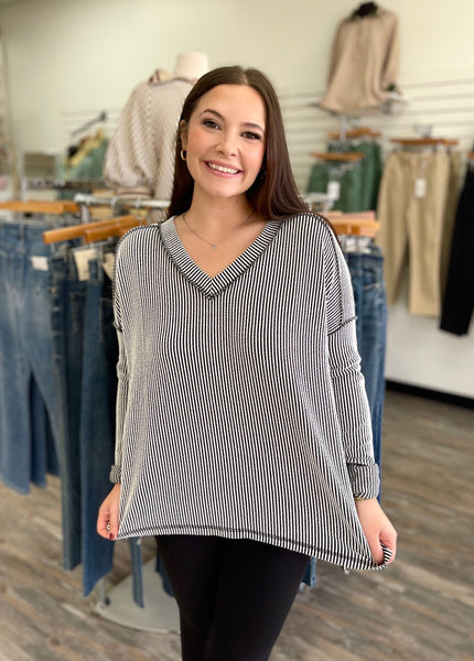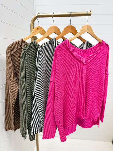 Embrace cozy chic with the Simply Ribbed V-Neck Top! Featuring a flattering v-neckline and trendy exposed seams, this long-sleeve essential adds subtle edge to your everyday look. The soft ribbed fabric keeps you snug while the vibrant color options—classic black & white, bold hot pink, earthy olive, and warm brown—let your personality shine. Perfect for layering or wearing solo, this top brings playful style and comfort together seamlessly.